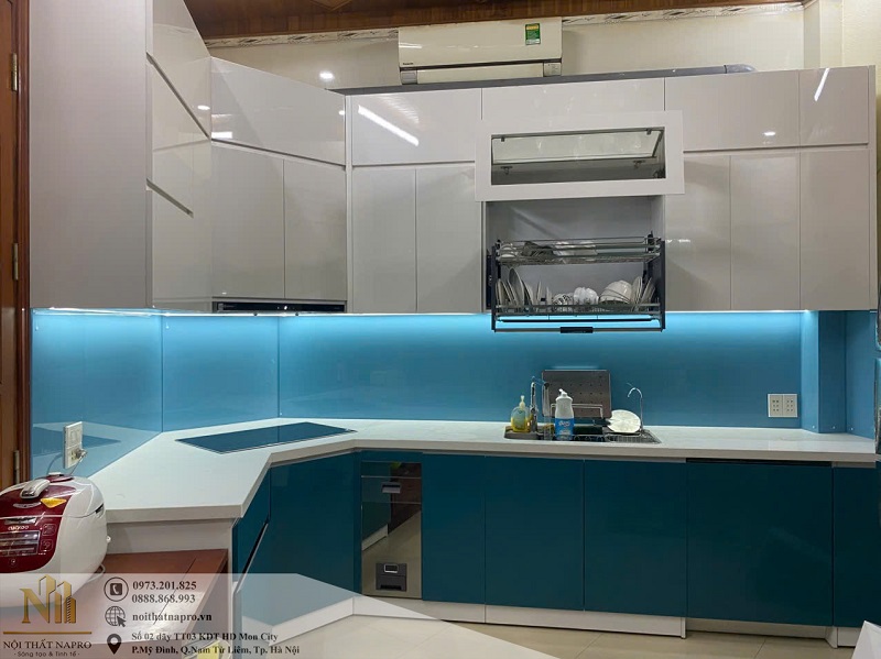 Ảnh thực tế mẫu tủ bếp inox cánh kính màu xanh - trắng ấn tượng
