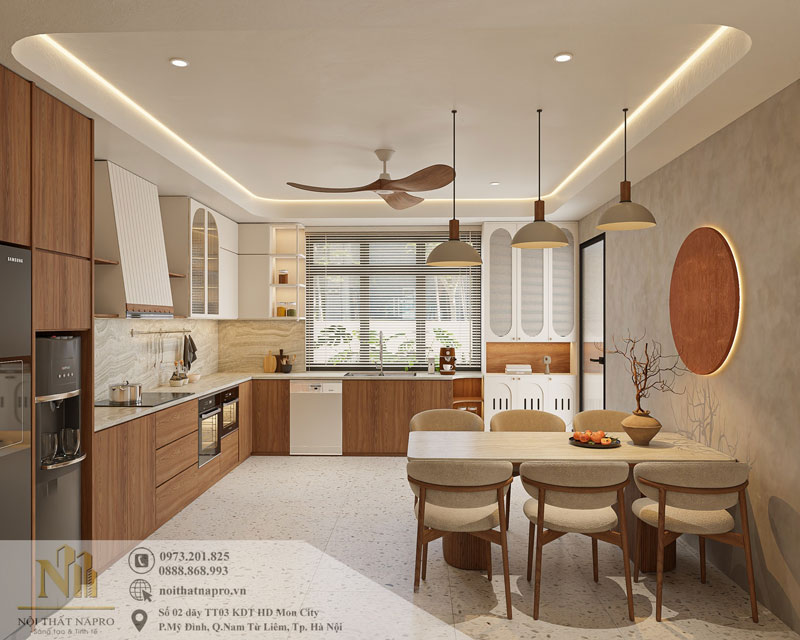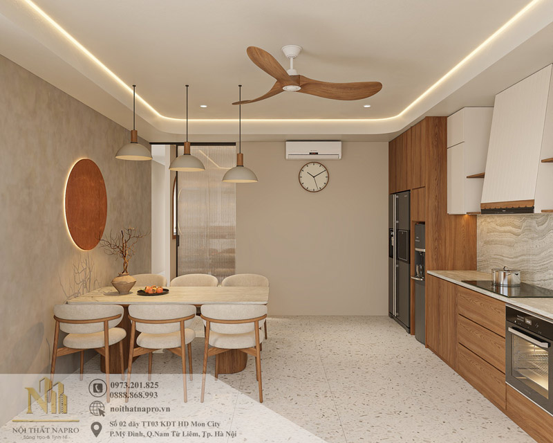 Bố trí đèn LED hắt trần giúp tạo hiệu ứng ánh sáng mềm, tăng chiều sâu cho không gian. Kết hợp đèn âm trần và đèn thả bàn ăn tạo điểm nhấn ấm cúng. Quạt trần gỗ được đặt trung tâm không chỉ có tính năng làm mát mà còn góp phần hoàn thiện phong cách nội thất hiện đại, tự nhiên.