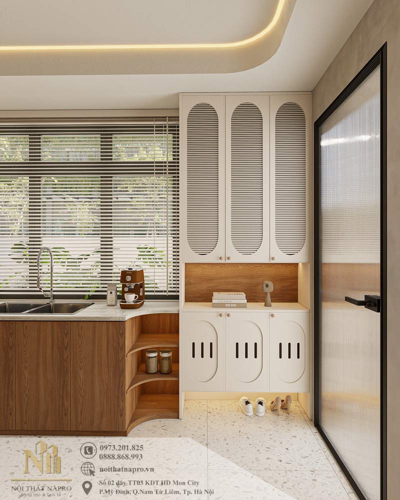 Một trong những điểm tinh tế của thiết kế là bố trí tủ cao sát cửa. Phía dưới là tủ giày âm, rất tiện khi sử dụng. Bên trên là các khoang tủ lớn với cánh lỗ oval đặc trưng, phù hợp để cất thực phẩm khô, đồ gia dụng ít dùng hoặc máy móc nhỏ. Ở giữa là một ô kệ mở vừa là điểm nhấn thẩm mỹ vừa tạo cảm giác cân bằng về chiều cao.