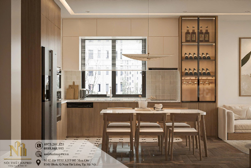 Bên cạnh hệ tủ bếp chính, tủ kính trưng bày rượu và đồ trang trí được bố trí khéo léo, góp phần nâng cao giá trị thẩm mỹ cho không gian. Kính trong kết hợp đèn led âm tạo hiệu ứng ánh sáng sang trọng, giúp khu vực bếp trở nên nổi bật nhưng vẫn giữ được sự tinh tế và đồng bộ với tổng thể.