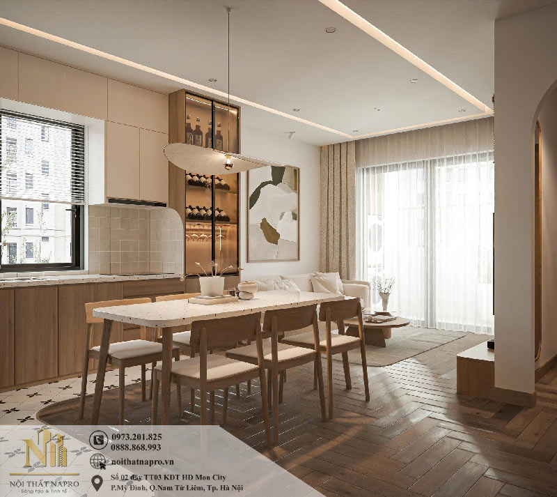Bộ bàn ăn được xem là điểm nhấn trung tâm của không gian, vừa là nơi chuẩn bị thực phẩm vừa đóng vai trò bàn ăn gia đình. Thiết kế bàn gọn gàng, kết hợp ghế ăn đồng bộ tạo nên khu vực sinh hoạt chung ấm cúng. Giải pháp này đặc biệt phù hợp với các gia đình yêu thích không gian mở và sự kết nối trong sinh hoạt.
