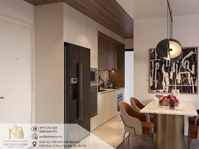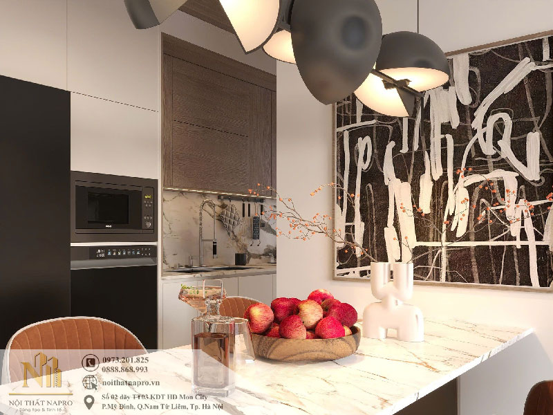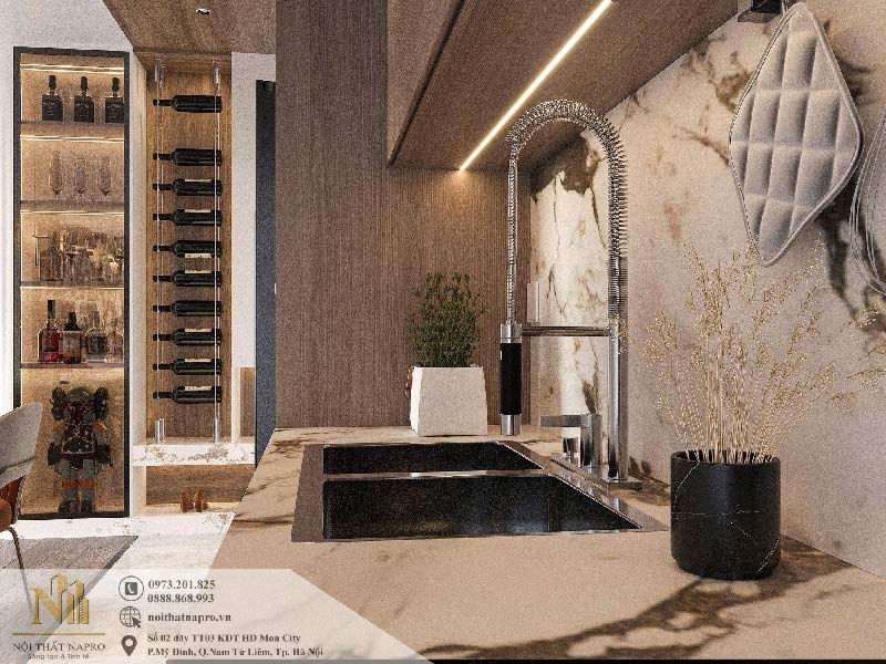 Bộ tủ bếp được tích hợp đầy đủ thiết bị hiện đại gồm lò nướng âm, lò vi sóng âm, đặt cạnh tủ lạnh theo trục thẳng, rất thuận tiện cho thói quen nấu nướng của gia đình. Bếp nấu và bồn rửa được sắp xếp theo nguyên tắc tam giác công năng, giúp người dùng di chuyển linh hoạt, tiết kiệm thời gian khi chế biến món ăn.