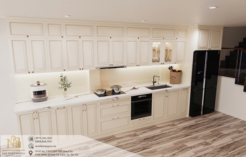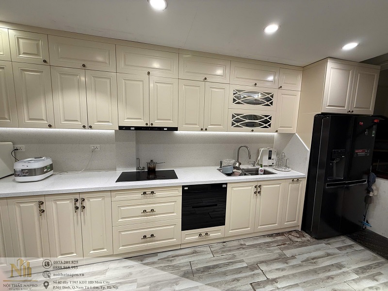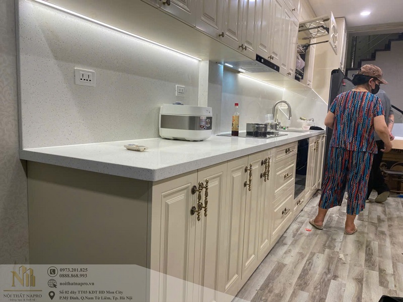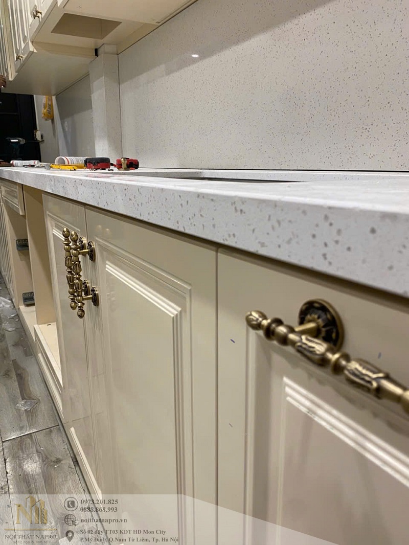 Nhằm tạo sự tiện lợi trong quá trình sử dụng thì nội thất Napro có lắp đặt tủ bếp trên tay nắm tròn nhỏ xinh kết hợp với tay nắm kiểu cong tân cổ điển tủ dưới cực sang, đẹp. Đây là phụ kiện không chỉ tạo điểm nhấn cho bộ tủ bếp trắng mà còn hỗ trợ gia chủ đóng kéo mở tủ đi cất và lấy đồ cần thiết.