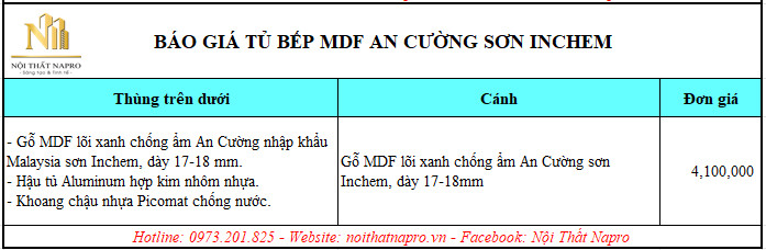 Hiện, giá tủ bếp MDF An Cường sơn Inchem tại Nội Thất Napro có đơn giá là 4.100.000đ/m dài. Giá bao gồm tủ trên + dưới cao tiêu chuẩn 225cm.